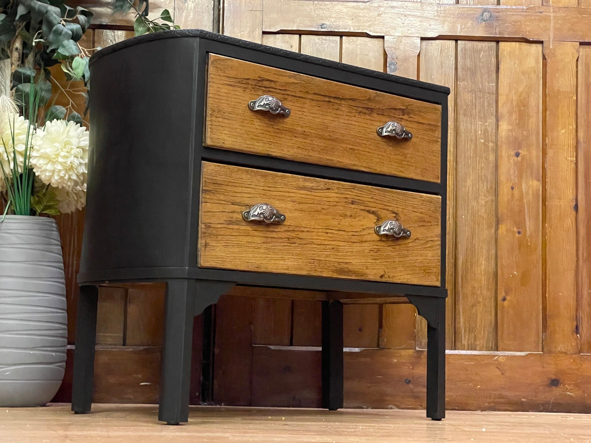 Painted in Black, Loof by Frenchic with the drawers left bare with ornate copper finish handles. The piece is quite rustic and has nice character.