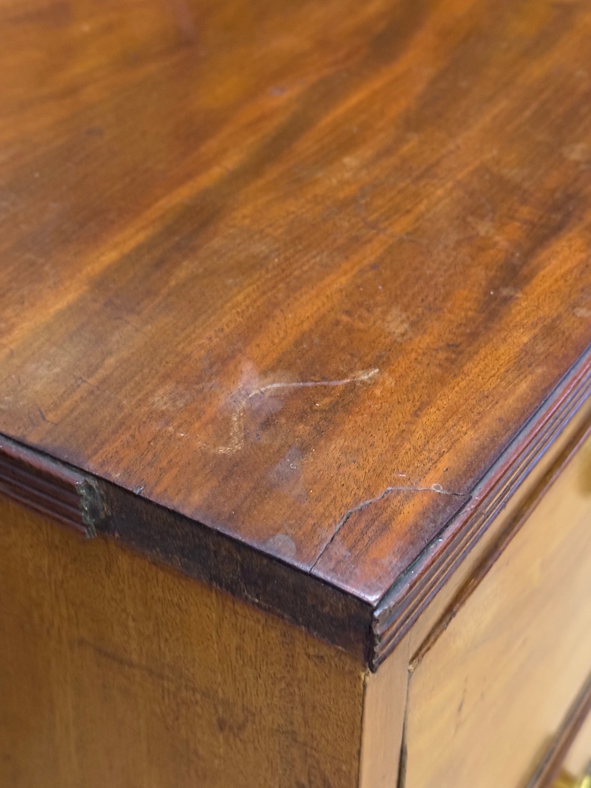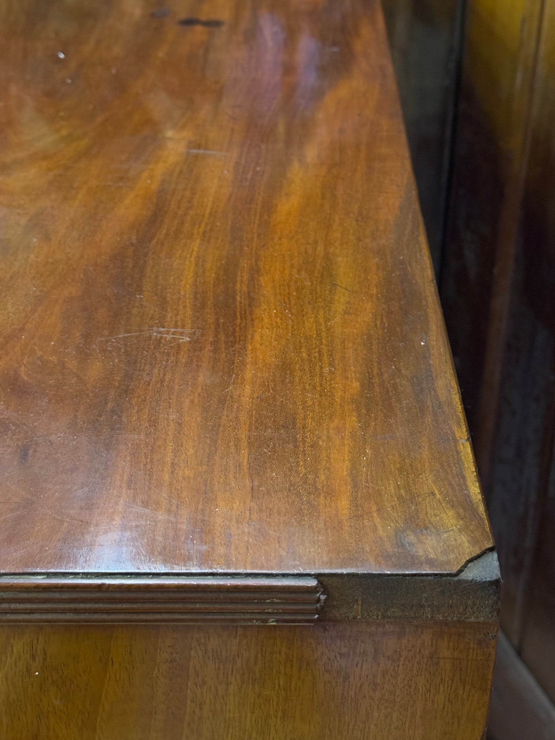 In good antique condition with wear commensurate with age and use. Some loss to the cock beading around the drawers and the knibs have some dents.